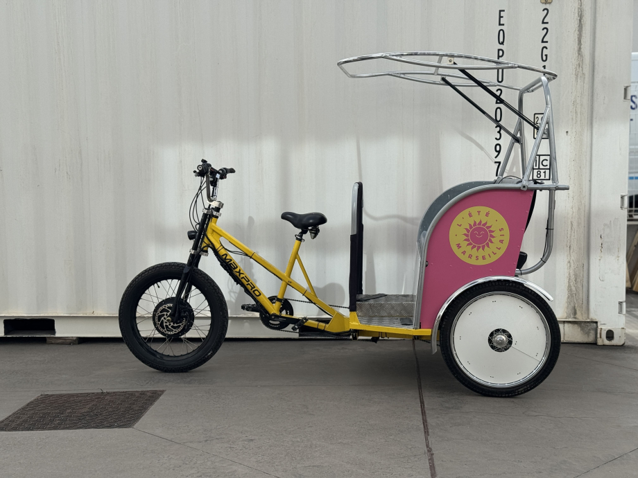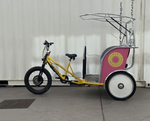 Images de vélos triporteurs électriques et de leurs utilisations. Ces vélos sont basés sur le transport de personnes ou marchandises, grâce à des sièges ou un conteneur intégré. Ce type de vélo possède en effet 3 roues.